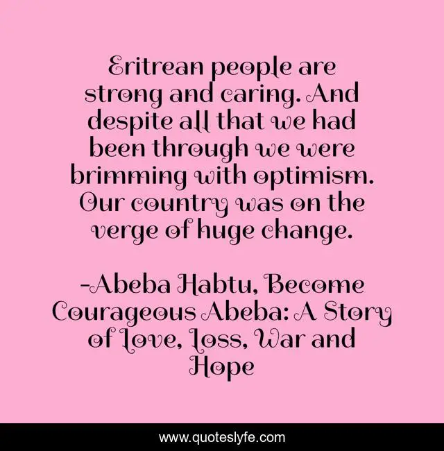 This page presents the quote "Eritrean people are strong and caring. And despite all that we had been through we were brimming with optimism. Our country was on the verge of huge change.". Author of this quote is Abeba Habtu, Become Courageous Abeba: A Story of Love, Loss, War and Hope. This quote is about caring, eritrea, love, human-rights, hope, optimism, change, affection,.