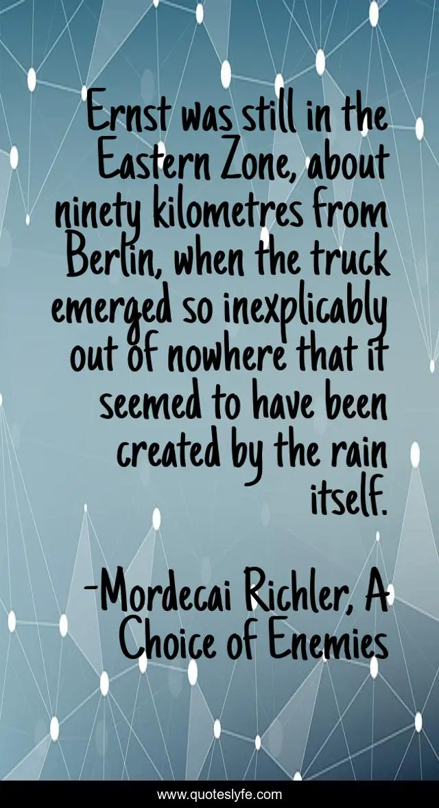 This page presents the quote "Ernst was still in the Eastern Zone, about ninety kilometres from Berlin, when the truck emerged so inexplicably out of nowhere that it seemed to have been created by the rain itself.". Author of this quote is Mordecai Richler, A Choice of Enemies. This quote is about europe, red-scare, scathing, canadian, paris, opening-sentences, north-america, satire, american,.