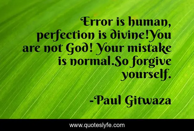 This page presents the quote "Error is human, perfection is divine!You are not God! Your mistake is normal.So forgive yourself.". Author of this quote is Paul Gitwaza. This quote is about god, error, community, yourself, mistakes, leadership, church, life-and-living, forgiveness,.