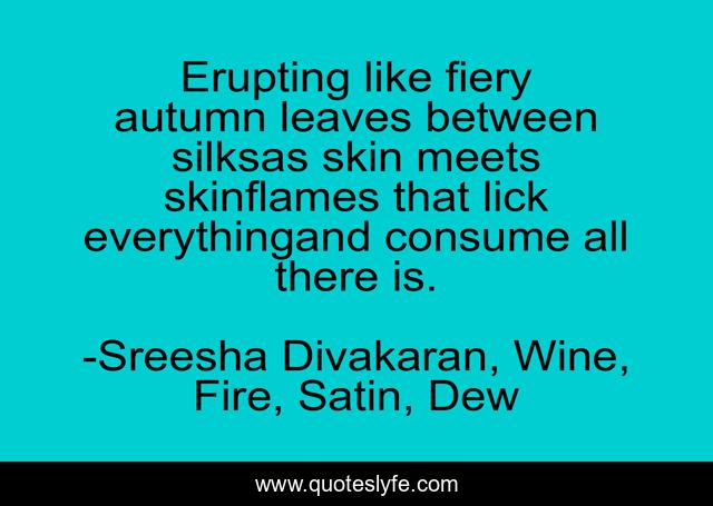 This page presents the quote "Erupting like fiery autumn leaves between silksas skin meets skinflames that lick everythingand consume all there is.". Author of this quote is Sreesha Divakaran, Wine, Fire, Satin, Dew. This quote is about passionate-love, passion, skin,.