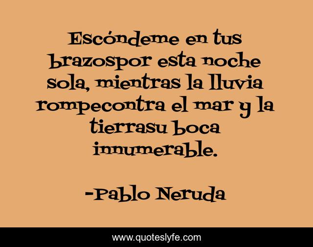 This page presents the quote "Escóndeme en tus brazospor esta noche sola, mientras la lluvia rompecontra el mar y la tierrasu boca innumerable.". Author of this quote is Pablo Neruda. This quote is about love, poetry, affection,.