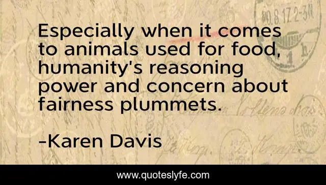 This page presents the quote "Especially when it comes to animals used for food, humanity’s reasoning power and concern about fairness plummets.". Author of this quote is Karen Davis. This quote is about veganism, moral-responsibility, animal-rights, vegan, fairness, animals, ethics, morality,.