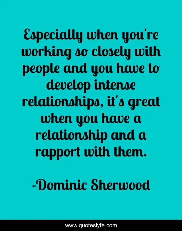 This page presents the quote "Especially when you're working so closely with people and you have to develop intense relationships, it's great when you have a relationship and a rapport with them.". Author of this quote is Dominic Sherwood. This quote is about relationships, great, people,.