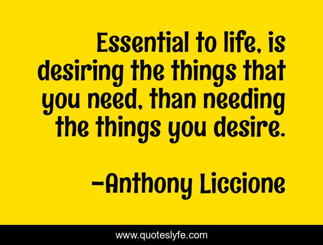 This page presents the quote "Essential to life, is desiring the things that you need, than needing the things you desire.". Author of this quote is Anthony Liccione. This quote is about desire, need, life, vain, things,.