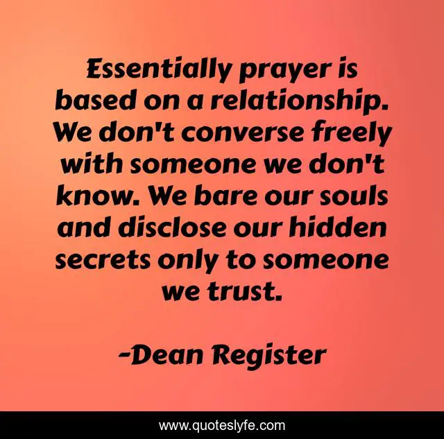 This page presents the quote "Essentially prayer is based on a relationship. We don't converse freely with someone we don't know. We bare our souls and disclose our hidden secrets only to someone we trust.". Author of this quote is Dean Register. .