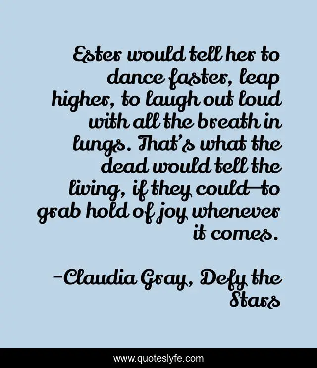 This page presents the quote "Ester would tell her to dance faster, leap higher, to laugh out loud with all the breath in lungs. That’s what the dead would tell the living, if they could—to grab hold of joy whenever it comes.". Author of this quote is Claudia Gray, Defy the Stars. This quote is about joy, life, death,.