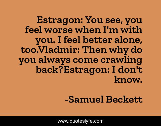 This page presents the quote "Estragon: You see, you feel worse when I'm with you. I feel better alone, too.Vladmir: Then why do you always come crawling back?Estragon: I don't know.". Author of this quote is Samuel Beckett. This quote is about drama, play, literature,.