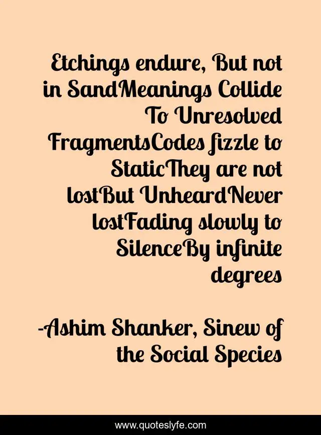 This page presents the quote "Etchings endure, But not in SandMeanings Collide To Unresolved FragmentsCodes fizzle to StaticThey are not lostBut UnheardNever lostFading slowly to SilenceBy infinite degrees". Author of this quote is Ashim Shanker, Sinew of the Social Species. This quote is about infinitude, evanescence, ephemerality, permanence, timeless-truth, poetry, static, empty-codes,.