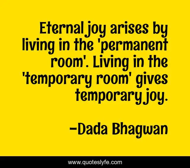 This page presents the quote "Eternal joy arises by living in the 'permanent room'. Living in the 'temporary room' gives temporary joy.". Author of this quote is Dada Bhagwan. This quote is about eternal, spiritual, permanent, temporary, rooms,.