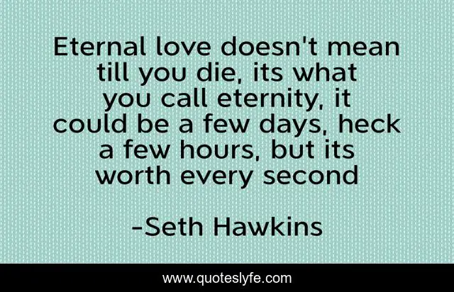 This page presents the quote "Eternal love doesn't mean till you die, its what you call eternity, it could be a few days, heck a few hours, but its worth every second". Author of this quote is Seth Hawkins. This quote is about eternity, death, love, affection,.