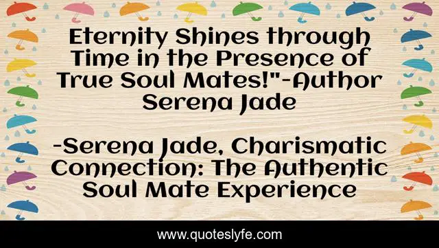 This page presents the quote "Eternity Shines through Time in the Presence of True Soul Mates!"-Author Serena Jade". Author of this quote is Serena Jade, Charismatic Connection: The Authentic Soul Mate Experience. This quote is about author-serena-jade, love, soul-mates, tantra, marriage, the-body, affection,.
