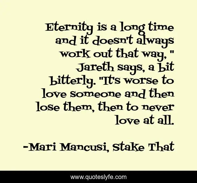 This page presents the quote "Eternity is a long time and it doesn't always work out that way, " Jareth says, a bit bitterly. "It's worse to love someone and then lose them, then to never love at all.". Author of this quote is Mari Mancusi, Stake That. This quote is about eternity, loss, love, affection,.