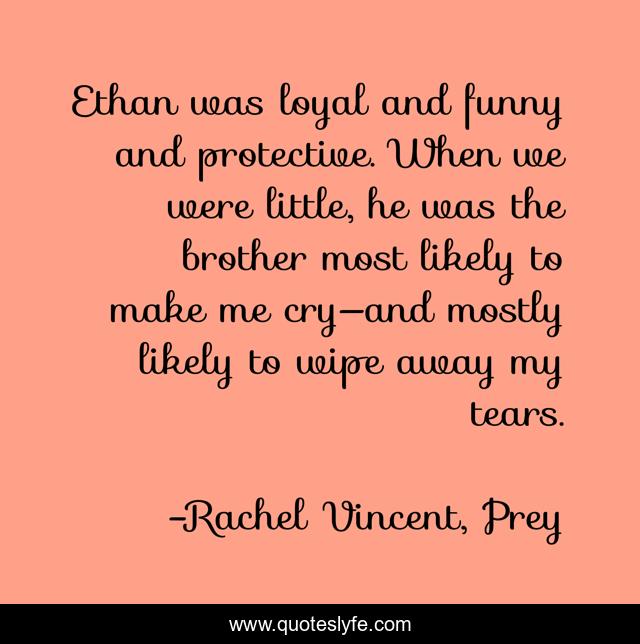 This page presents the quote "Ethan was loyal and funny and protective. When we were little, he was the brother most likely to make me cry—and mostly likely to wipe away my tears.". Author of this quote is Rachel Vincent, Prey. This quote is about death, love, brother, sibling, faythe-sanders, affection,.