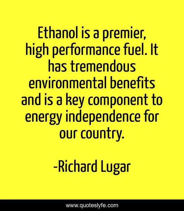 This page presents the quote "Ethanol is a premier, high performance fuel. It has tremendous environmental benefits and is a key component to energy independence for our country.". Author of this quote is Richard Lugar. This quote is about environmental, performance,.