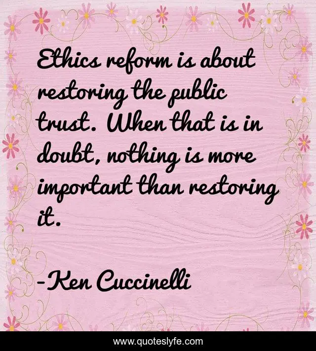 This page presents the quote "Ethics reform is about restoring the public trust. When that is in doubt, nothing is more important than restoring it.". Author of this quote is Ken Cuccinelli. This quote is about ethics, doubt, important,.