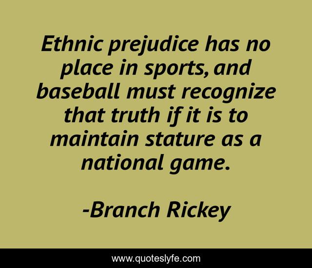 This page presents the quote "Ethnic prejudice has no place in sports, and baseball must recognize that truth if it is to maintain stature as a national game.". Author of this quote is Branch Rickey. This quote is about game, baseball, truth,.
