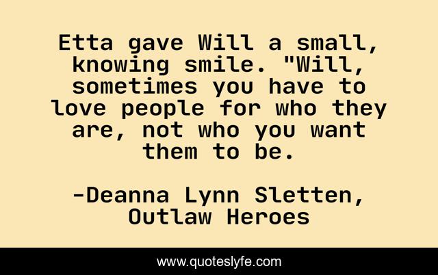 This page presents the quote "Etta gave Will a small, knowing smile. "Will, sometimes you have to love people for who they are, not who you want them to be.". Author of this quote is Deanna Lynn Sletten, Outlaw Heroes. This quote is about fiction-novel, middle-grade, young-adult, adventure, outlaw-heroes,.