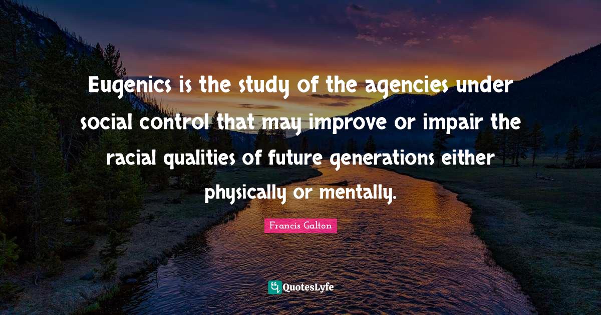 This page presents the quote "Eugenics is the study of the agencies under social control that may improve or impair the racial qualities of future generations either physically or mentally.". Author of this quote is Francis Galton. This quote is about generations, may, study, social control, future, eugenics, quality, agency,.