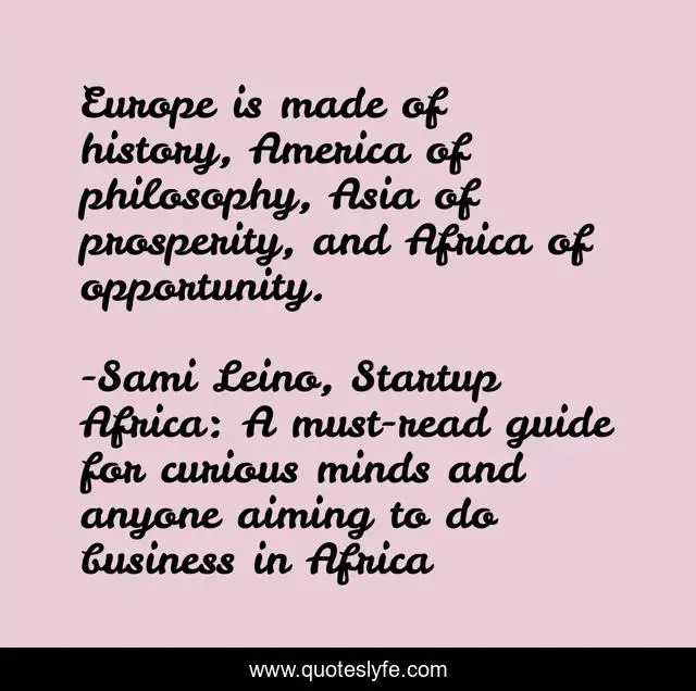This page presents the quote "Europe is made of history, America of philosophy, Asia of prosperity, and Africa of opportunity.". Author of this quote is Sami Leino, Startup Africa: A must-read guide for curious minds and anyone aiming to do business in Africa. This quote is about opportunity, capitalism, startup, world, entrepreneurship,.
