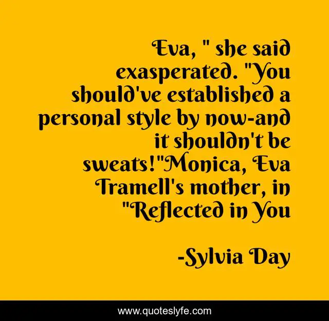 This page presents the quote "Eva, " she said exasperated. "You should've established a personal style by now-and it shouldn't be sweats!"Monica, Eva Tramell's mother, in "Reflected in You". Author of this quote is Sylvia Day. This quote is about fashion, humor,.