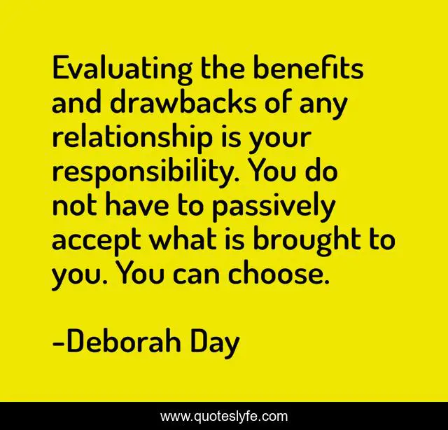 This page presents the quote "Evaluating the benefits and drawbacks of any relationship is your responsibility. You do not have to passively accept what is brought to you. You can choose.". Author of this quote is Deborah Day. This quote is about boundaries, relationships, friendship, self-help,.