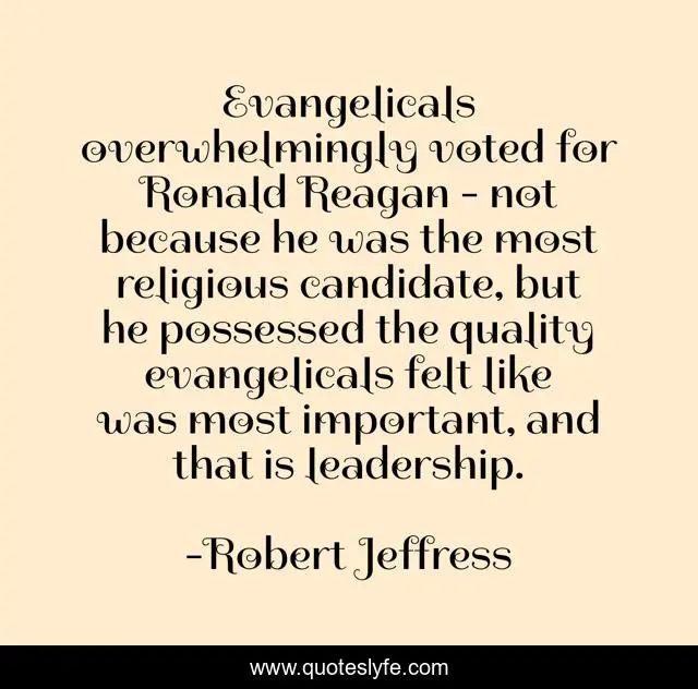 This page presents the quote "Evangelicals overwhelmingly voted for Ronald Reagan - not because he was the most religious candidate, but he possessed the quality evangelicals felt like was most important, and that is leadership.". Author of this quote is Robert Jeffress. This quote is about important, quality,.
