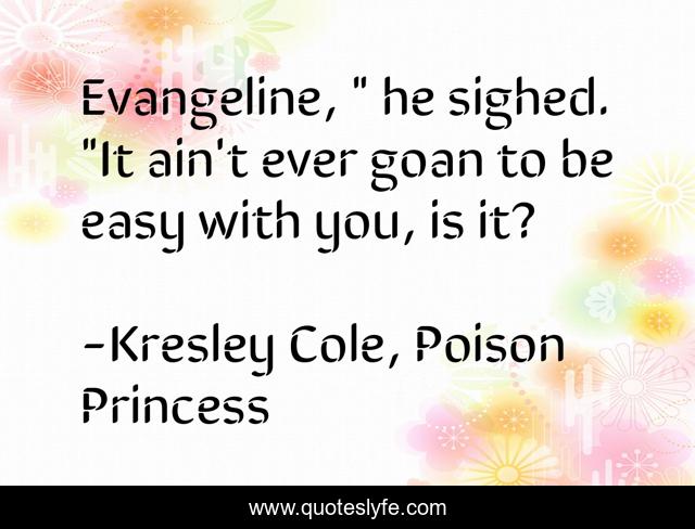 This page presents the quote "Evangeline, " he sighed. "It ain't ever goan to be easy with you, is it?". Author of this quote is Kresley Cole, Poison Princess. This quote is about romance, young-adult, dystopian, fiction,.