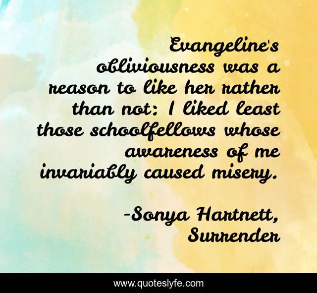 This page presents the quote "Evangeline's obliviousness was a reason to like her rather than not: I liked least those schoolfellows whose awareness of me invariably caused misery.". Author of this quote is Sonya Hartnett, Surrender. This quote is about obliviousness, awareness, misery,.