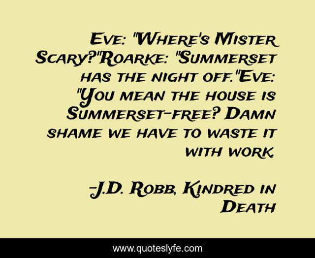 This page presents the quote "Eve: "Where's Mister Scary?"Roarke: "Summerset has the night off."Eve: "You mean the house is Summerset-free? Damn shame we have to waste it with work.". Author of this quote is J.D. Robb, Kindred in Death. This quote is about suspense, crime,.