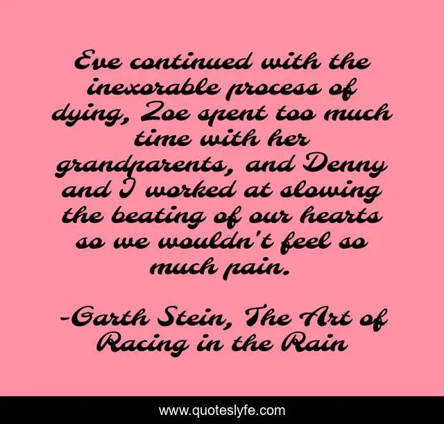 This page presents the quote "Eve continued with the inexorable process of dying, Zoe spent too much time with her grandparents, and Denny and I worked at slowing the beating of our hearts so we wouldn't feel so much pain.". Author of this quote is Garth Stein, The Art of Racing in the Rain. This quote is about life, pain, sad,.
