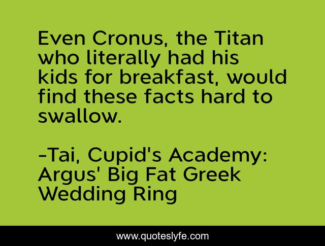 This page presents the quote "Even Cronus, the Titan who literally had his kids for breakfast, would find these facts hard to swallow.". Author of this quote is Tai, Cupid's Academy: Argus' Big Fat Greek Wedding Ring. This quote is about percy-jackson-and-the-olympians, greek-mythology, mythology, humor, cupid,.