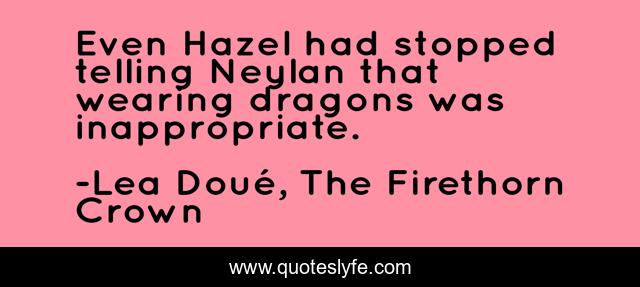 This page presents the quote "Even Hazel had stopped telling Neylan that wearing dragons was inappropriate.". Author of this quote is Lea Doué, The Firethorn Crown. This quote is about appropriate, fashion, wear, dragons,.