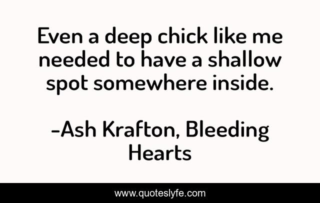 This page presents the quote "Even a deep chick like me needed to have a shallow spot somewhere inside.". Author of this quote is Ash Krafton, Bleeding Hearts. This quote is about romance, urban-fantasy, vampire,.