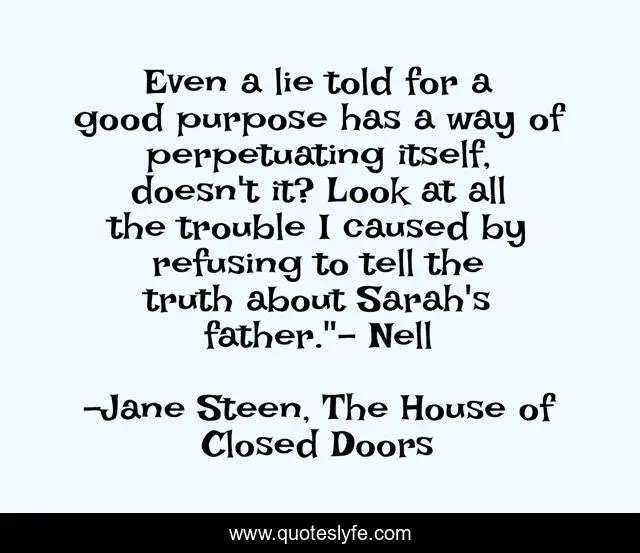 This page presents the quote "Even a lie told for a good purpose has a way of perpetuating itself, doesn't it? Look at all the trouble I caused by refusing to tell the truth about Sarah's father."- Nell". Author of this quote is Jane Steen, The House of Closed Doors. This quote is about lies, truth,.