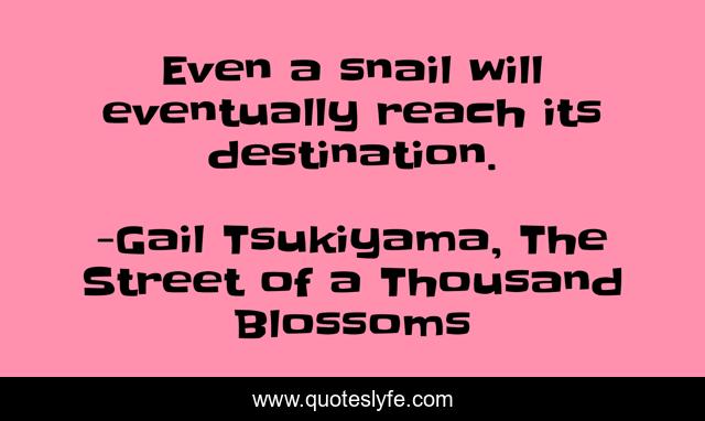 This page presents the quote "Even a snail will eventually reach its destination.". Author of this quote is Gail Tsukiyama, The Street of a Thousand Blossoms. This quote is about life, destiny, snail, destination, patience, waiting, goals,.