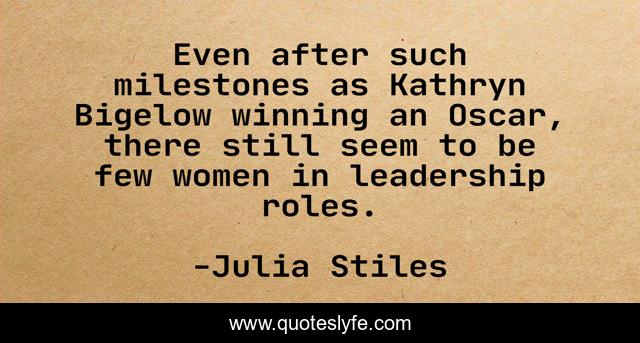 This page presents the quote "Even after such milestones as Kathryn Bigelow winning an Oscar, there still seem to be few women in leadership roles.". Author of this quote is Julia Stiles. This quote is about women, milestones, winning,.