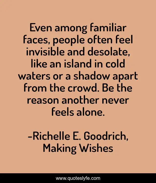 This page presents the quote "Even among familiar faces, people often feel invisible and desolate, like an island in cold waters or a shadow apart from the crowd. Be the reason another never feels alone.". Author of this quote is Richelle E. Goodrich, Making Wishes. This quote is about friendless, lonely, solitary, richelle-e-goodrich, alone, sadness, desolate, richelle, invisible,.