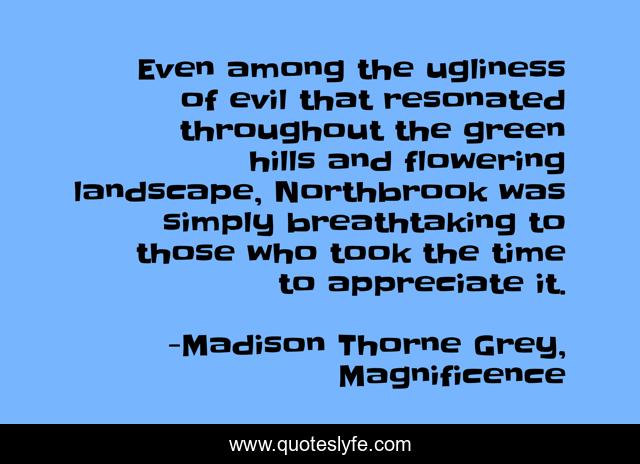 This page presents the quote "Even among the ugliness of evil that resonated throughout the green hills and flowering landscape, Northbrook was simply breathtaking to those who took the time to appreciate it.". Author of this quote is Madison Thorne Grey, Magnificence. This quote is about fantasy-romance, madison-thorne-grey, romance, alpha-males, romance-novels, paranormal-romance,.
