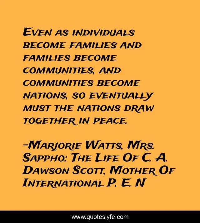 This page presents the quote "Even as individuals become families and families become communities, and communities become nations, so eventually must the nations draw together in peace.". Author of this quote is Marjorie Watts, Mrs. Sappho: The Life Of C. A. Dawson Scott, Mother Of International P. E. N. This quote is about pen-international, mrs-sappho, mothers-and-daughters, c-a-dawson-scott, peace, international-relations, individuals, communities, pen-american-center,.