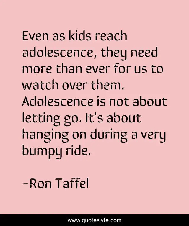 This page presents the quote "Even as kids reach adolescence, they need more than ever for us to watch over them. Adolescence is not about letting go. It's about hanging on during a very bumpy ride.". Author of this quote is Ron Taffel. This quote is about ride, letting go,.