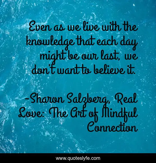 This page presents the quote "Even as we live with the knowledge that each day might be our last, we don’t want to believe it.". Author of this quote is Sharon Salzberg, Real Love: The Art of Mindful Connection. This quote is about living-in-the-moment, living-in-the-present, death, real-love, death-and-dying,.