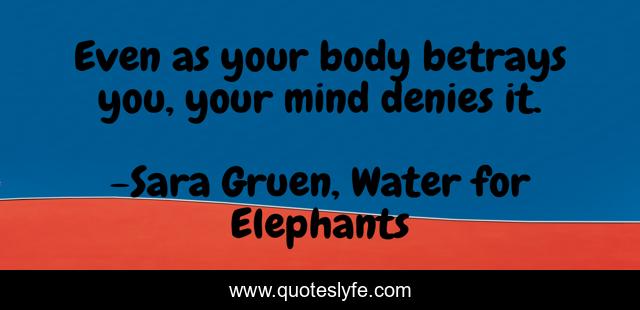This page presents the quote "Even as your body betrays you, your mind denies it.". Author of this quote is Sara Gruen, Water for Elephants. This quote is about body, life, denial, betrayal, mind, truth,.