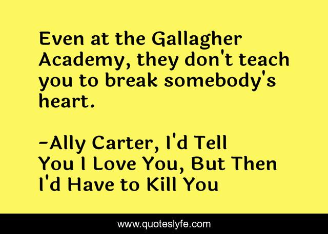 This page presents the quote "Even at the Gallagher Academy, they don't teach you to break somebody's heart.". Author of this quote is Ally Carter, I'd Tell You I Love You, But Then I'd Have to Kill You. This quote is about gallagher-academy, heartbreak,.