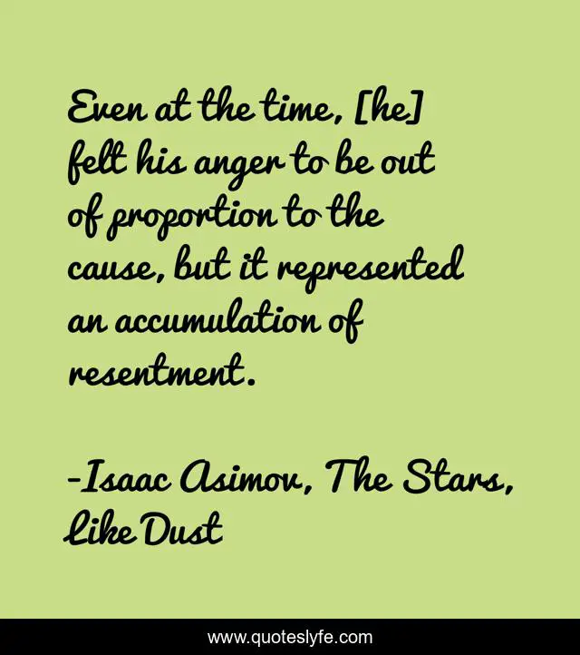 This page presents the quote "Even at the time, [he] felt his anger to be out of proportion to the cause, but it represented an accumulation of resentment.". Author of this quote is Isaac Asimov, The Stars, Like Dust. .