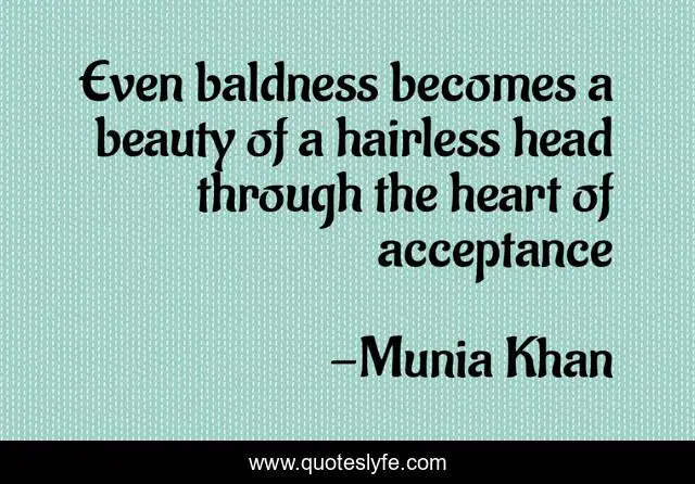 This page presents the quote "Even baldness becomes a beauty of a hairless head through the heart of acceptance". Author of this quote is Munia Khan. This quote is about heart, acceptance, beauty, less, bald, accept, reality, hair, acceptance-of-oneself,.