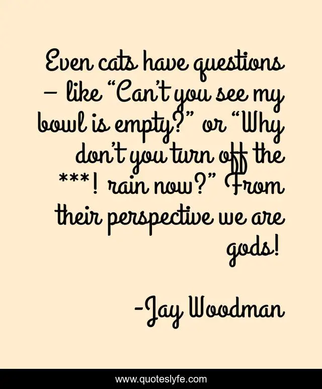 This page presents the quote "Even cats have questions – like “Can’t you see my bowl is empty?” or “Why don’t you turn off the ***! rain now?” From their perspective we are gods!". Author of this quote is Jay Woodman. This quote is about gods, cats, cats-humor, questions-in-life, questions,.