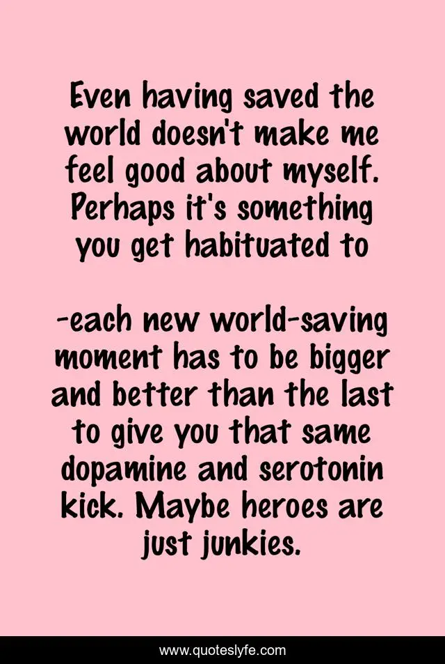 This page presents the quote "Even having saved the world doesn't make me feel good about myself. Perhaps it's something you get habituated to". Author of this quote is each new world-saving moment has to be bigger and better than the last to give you that same dopamine and serotonin kick. Maybe heroes are just junkies.. This quote is about charlie human, kill baxter,.