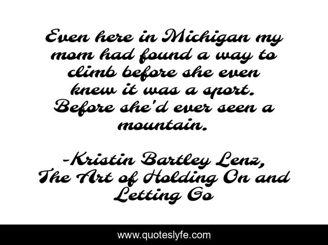 This page presents the quote "Even here in Michigan my mom had found a way to climb before she even knew it was a sport. Before she'd ever seen a mountain.". Author of this quote is Kristin Bartley Lenz, The Art of Holding On and Letting Go. .