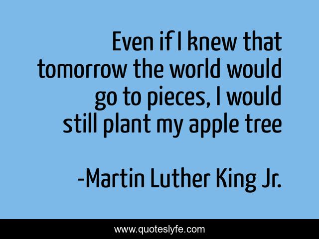 This page presents the quote "Even if I knew that tomorrow the world would go to pieces, I would still plant my apple tree". Author of this quote is Martin Luther King Jr.. This quote is about plants, apple, peace, growth, human, hope,.