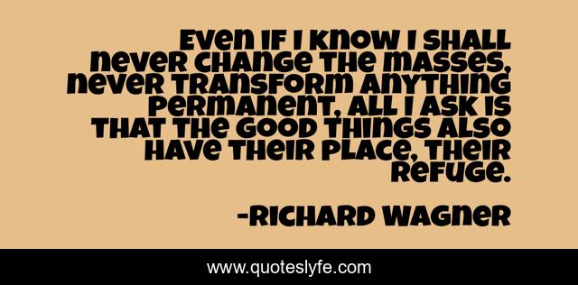 This page presents the quote "Even if I know I shall never change the masses, never transform anything permanent, all I ask is that the good things also have their place, their refuge.". Author of this quote is Richard Wagner. This quote is about good, good things,.